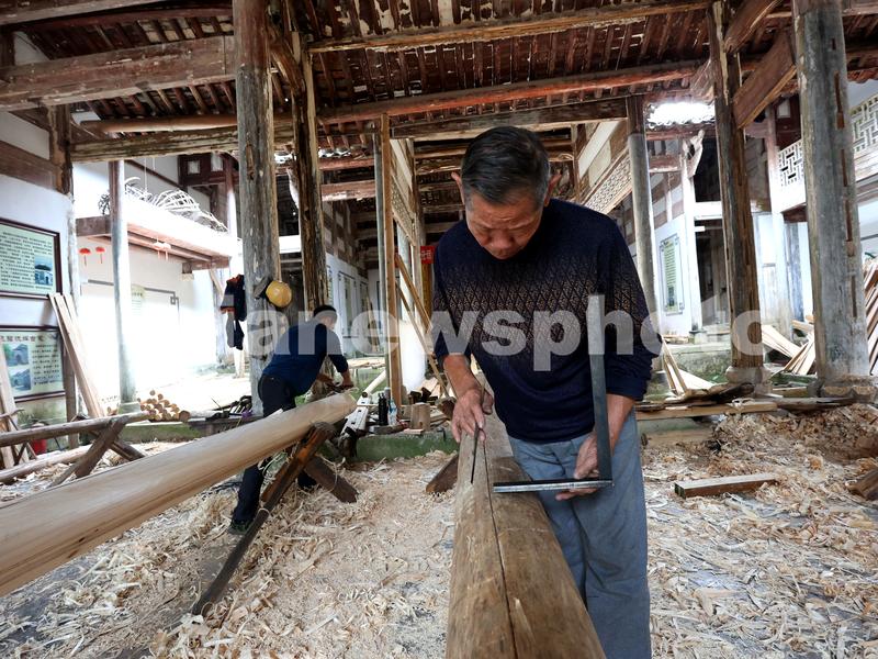图片说明:2021年10月12日,在江西省抚州市东乡区黎圩镇浯溪村,工匠正忙着修缮古建筑。