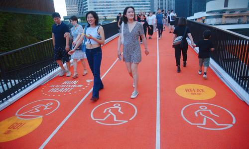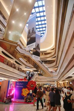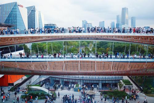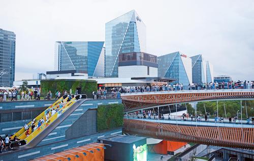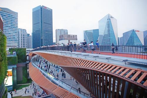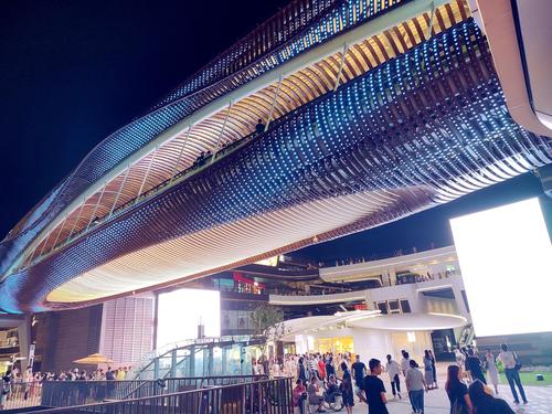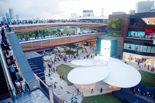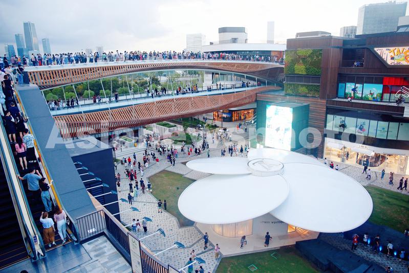 2021年10月10日,上海,浦东文化旅游消费新地标前滩太古里商业中心的首个“双层开放空间”屋顶天空环道与造型如花瓣的路易威登(LV)品牌店成为申城网红景观。