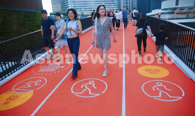 图片说明:2021年10月10日,上海,浦东文化旅游新地标前滩太古里商业中心的网红屋顶天空步道、消费者购物健身两不误。