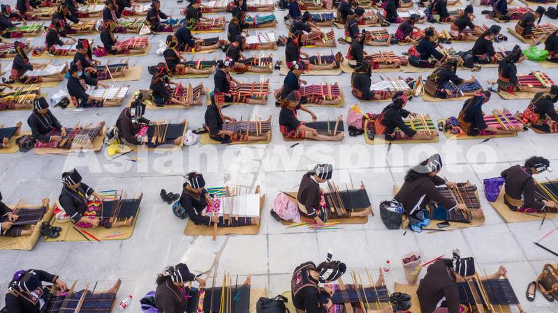 图片说明:2021年10月16日,在海南省东方市文化广场,千名身着传统服装的黎族妇女熟练织黎锦秀技艺。