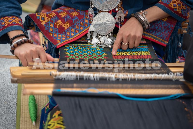 图片说明:2021年10月16日,在海南省东方市文化广场,千名身着传统服装的黎族妇女熟练织黎锦秀技艺。
