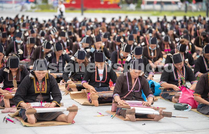 图片说明:2021年10月16日,在海南省东方市文化广场,千名身着传统服装的黎族妇女熟练织黎锦秀技艺。