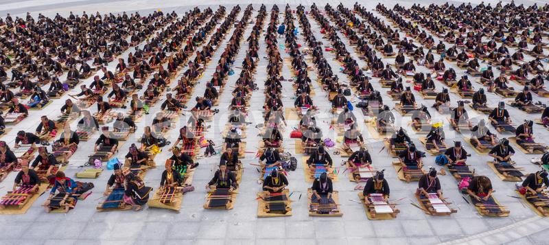 图片说明:2021年10月16日,在海南省东方市文化广场,千名身着传统服装的黎族妇女熟练织黎锦秀技艺。