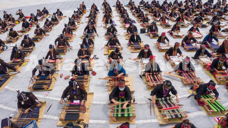 图片说明:2021年10月16日,在海南省东方市文化广场,千名身着传统服装的黎族妇女熟练织黎锦秀技艺。