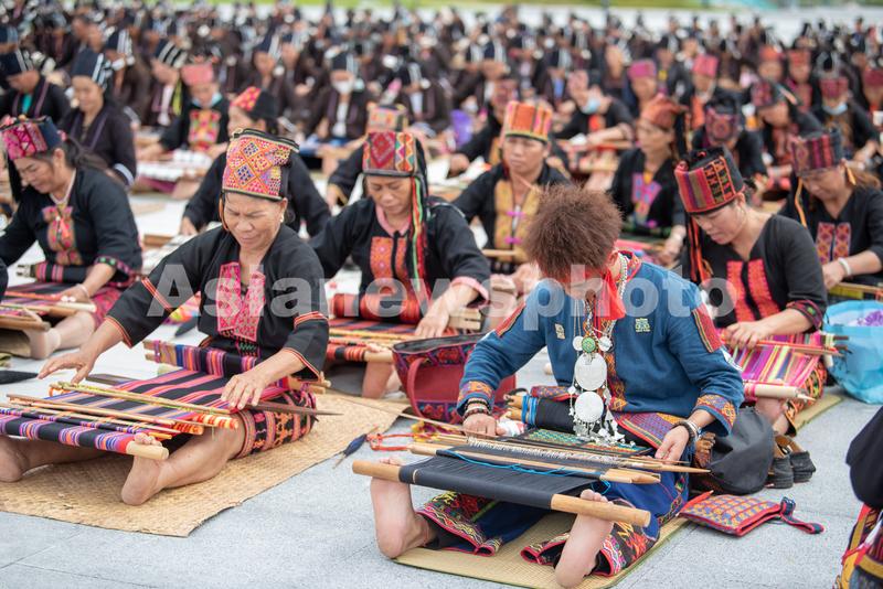 图片说明:2021年10月16日,在海南省东方市文化广场,23岁的黎族小伙黄杨伟已学习7年织锦技艺,他是这次技艺展示的唯一男生。