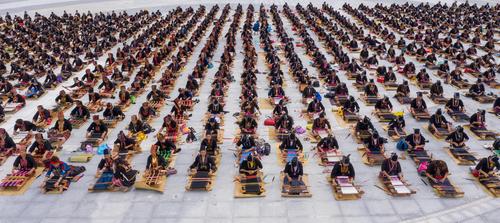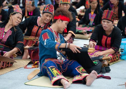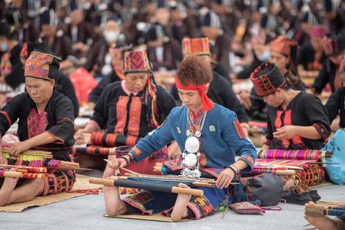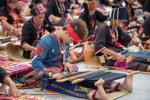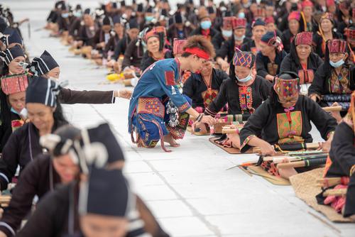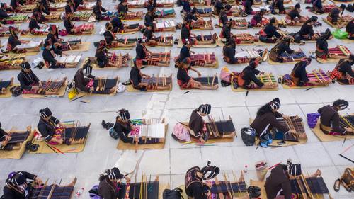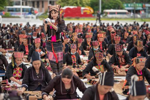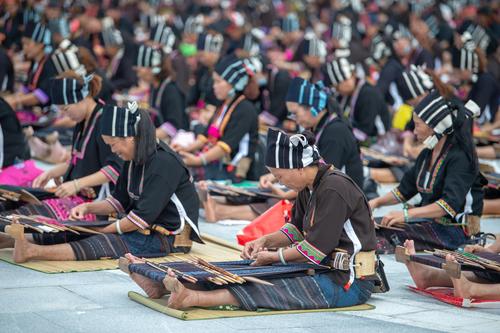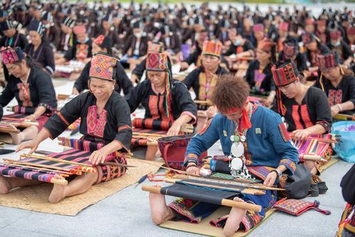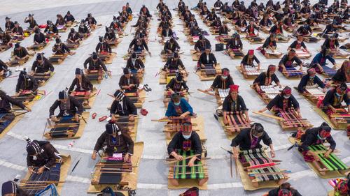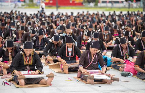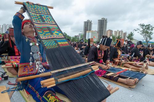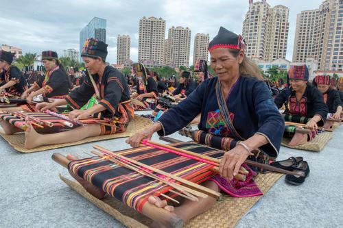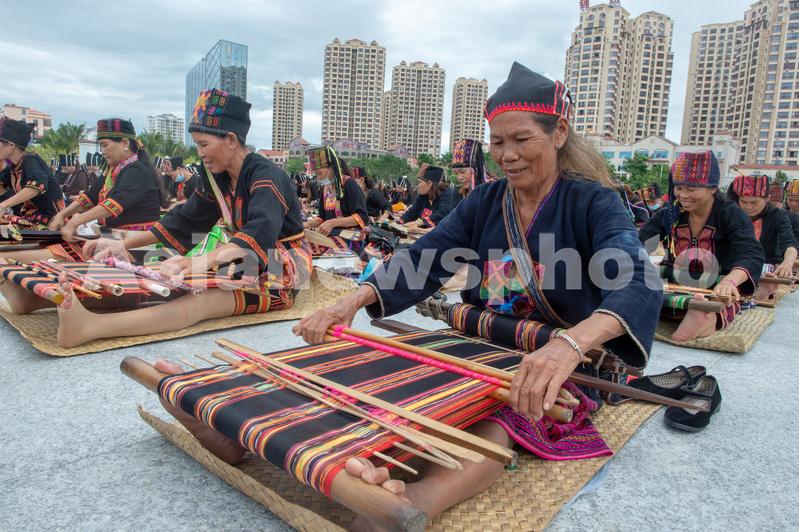 图片说明:2021年10月16日,在海南省东方市文化广场,千名身着传统服装的黎族妇女熟练织黎锦秀技艺。