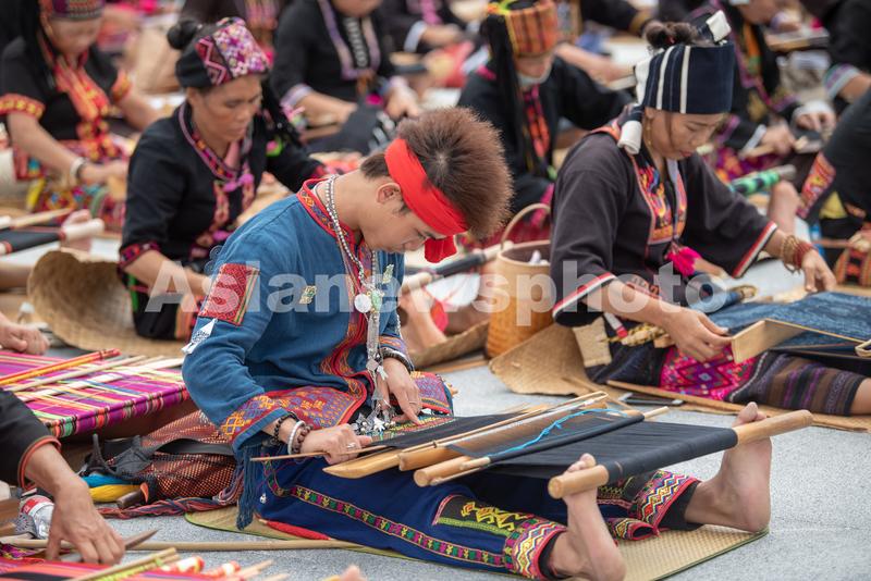 图片说明:2021年10月16日,在海南省东方市文化广场,23岁的黎族小伙黄杨伟已学习7年织锦技艺,他是这次技艺展示的唯一男生。