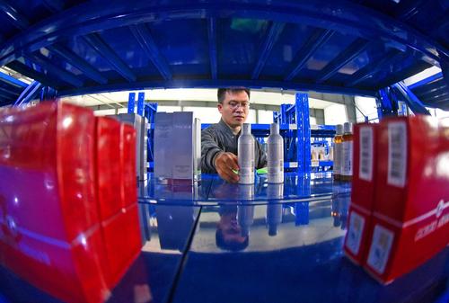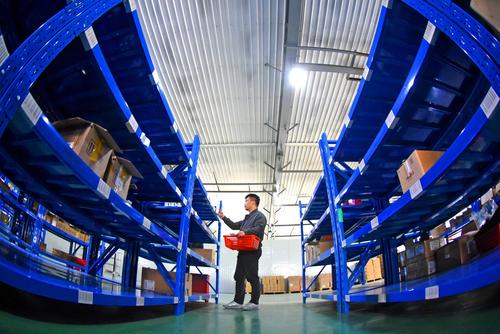 图片说明:2021年10月20日,连云港综合保税区一家跨境电商物流仓库,工作人员按照订单进行备货。