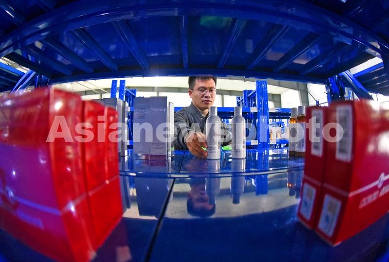 图片说明:2021年10月20日,连云港综合保税区一家跨境电商物流仓库,工作人员按照订单进行备货。