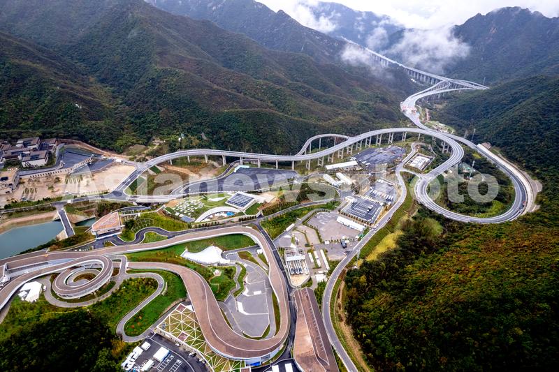 图片说明:2021年10月6日,北京市延庆区张山营镇西大庄科村,2022北京冬奥会冬残奥会延庆冬奥村附近的国家雪车雪橇中心。(无人机航拍)