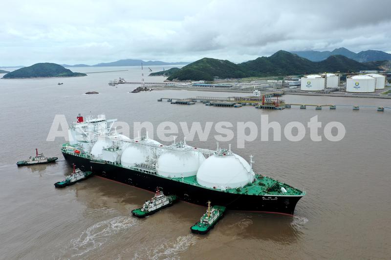 图片说明:2021年10月13日,巴拿马籍的“BISHU MARU”(尾州丸)号LNG船带着15.5万方天然气从美国安全抵达浙江舟山。