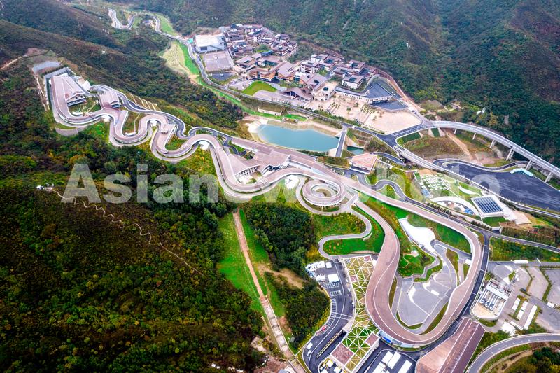 图片说明:2021年10月6日,北京市延庆区张山营镇西大庄科村,2022北京冬奥会冬残奥会延庆冬奥村附近的国家雪车雪橇中心。(无人机航拍)