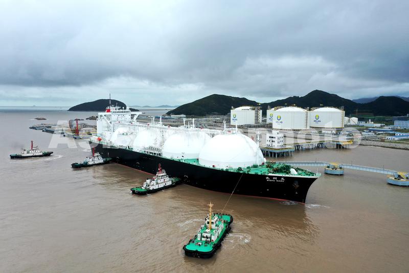 图片说明:2021年10月13日,巴拿马籍的“BISHU MARU”(尾州丸)号LNG船带着15.5万方天然气从美国安全抵达浙江舟山。