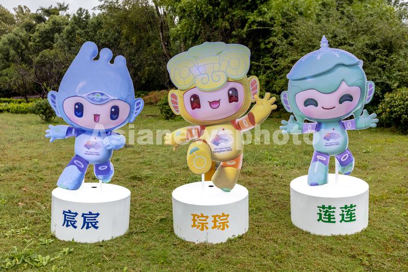 20121年10月16日,浙江省杭州市富阳区街头的2022亚运会吉祥物:机器人琮琮、莲莲和宸宸。