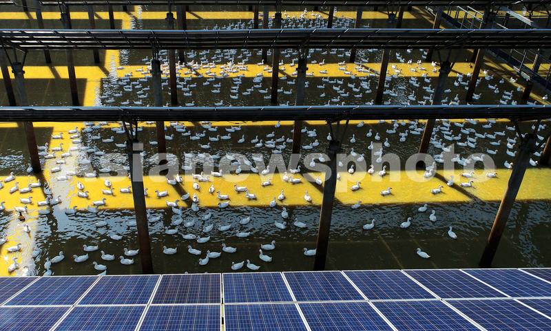 2021年10月29日,养殖户在安徽省合肥市庐江县白湖镇“渔光互补”光伏发电站水面放养白鸭。