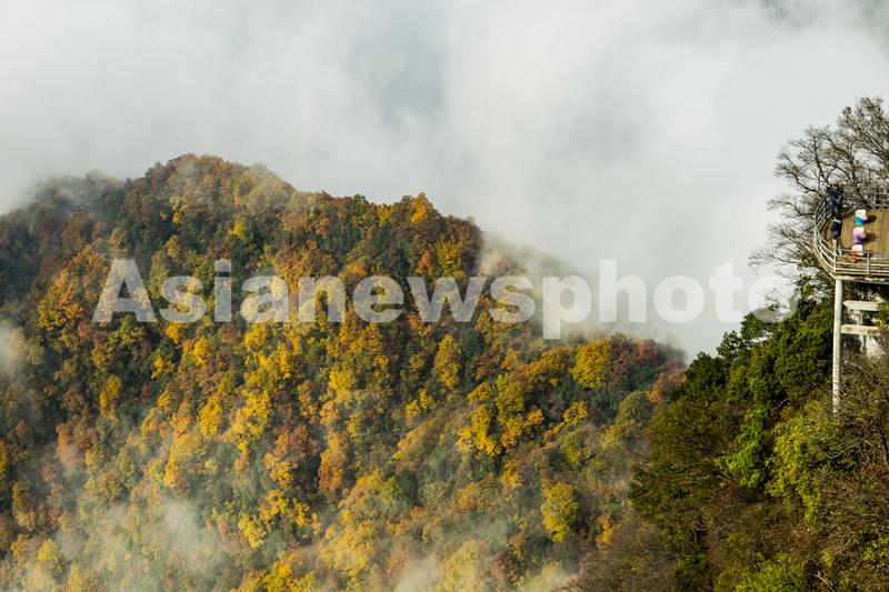 图片说明:游人在龙头山旅游景区空中栈道拍摄云雾美景