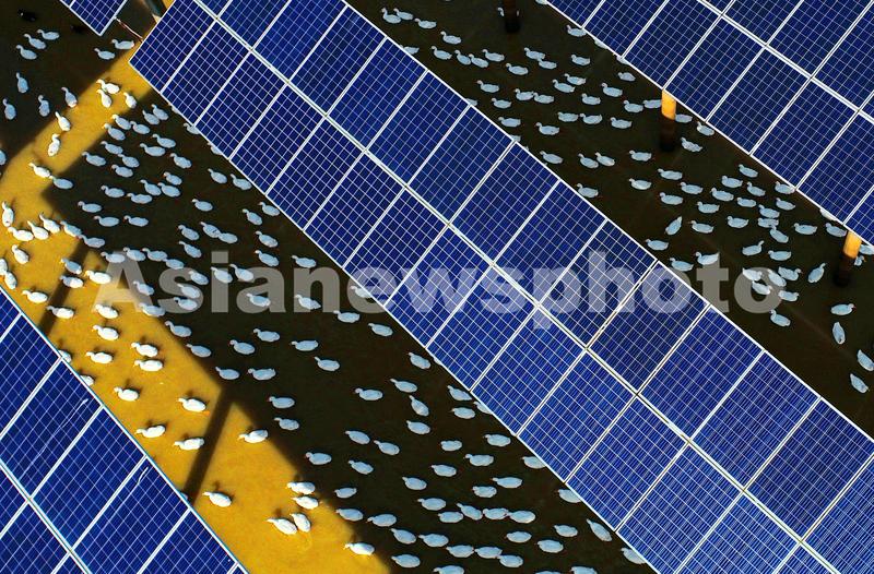 2021年10月29日,养殖户在安徽省合肥市庐江县白湖镇“渔光互补”光伏发电站水面放养白鸭。