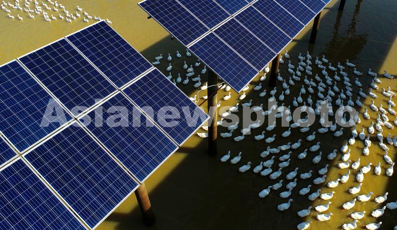 2021年10月29日,养殖户在安徽省合肥市庐江县白湖镇“渔光互补”光伏发电站水面放养白鸭。