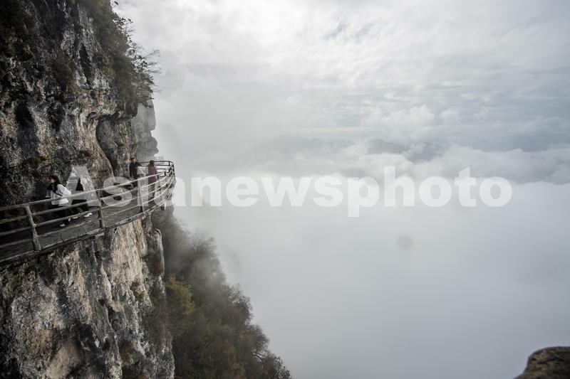图片说明:游人在龙头山旅游景区空中栈道观赏云雾美景
