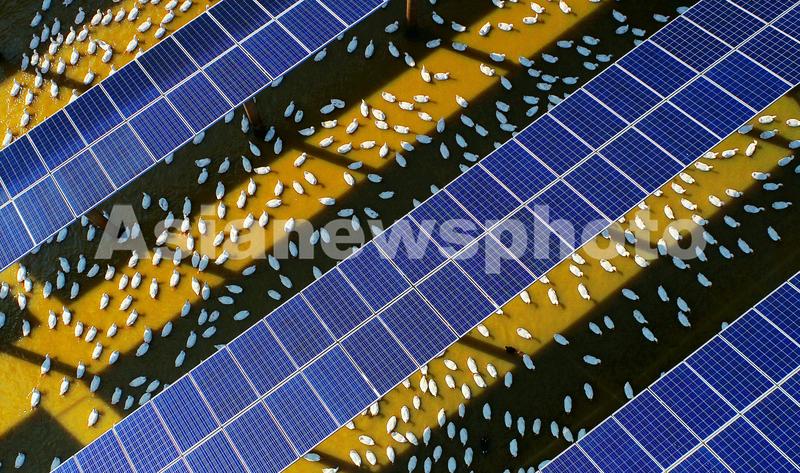 2021年10月29日,养殖户在安徽省合肥市庐江县白湖镇“渔光互补”光伏发电站水面放养白鸭。