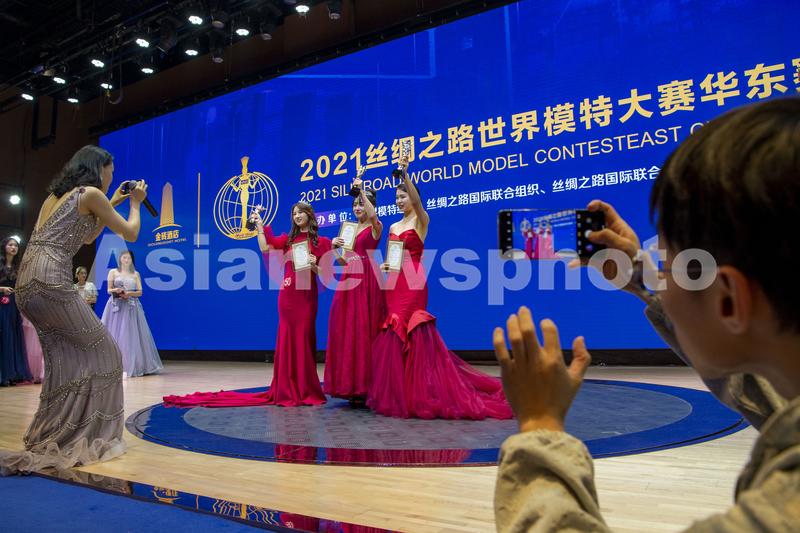 图片说明:2021年10月31日,在江苏省海安市举行的2021丝绸之路世界模特大赛华东赛区总决赛结束后,获奖选手在拍照留念。