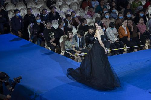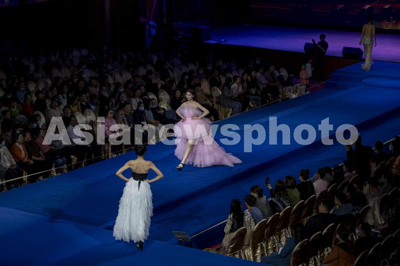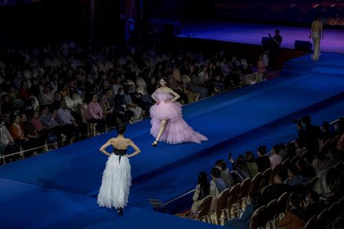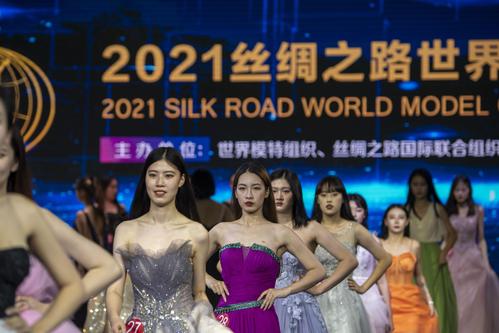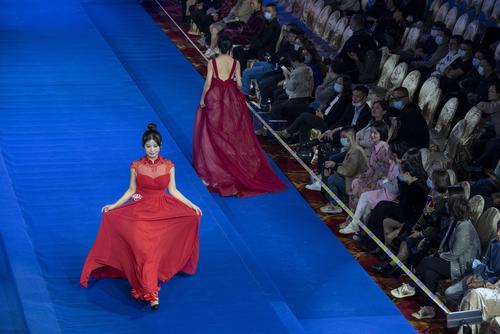 图片说明:2021年10月31日,在江苏省海安市举行的2021丝绸之路世界模特大赛华东赛区总决赛上,参赛选手在进行晚礼服展示。