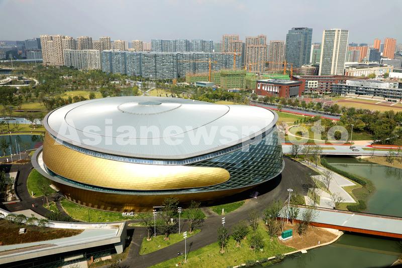 图片说明:2021年10月31日,拍摄的浙江省杭州市拱墅区大运河亚运公园体育馆,2022年亚运会期间,将承办乒乓球、霹雳舞两项赛事。