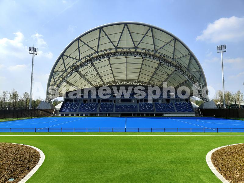 图片说明:2021年10月31日,拍摄的浙江省杭州市拱墅区大运河亚运公园体育场,2022年亚运会期间,将承办曲棍球项目赛事。