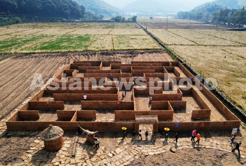 2021年10月31日,杭州市民在稻田迷宫中边游玩边寻找出口。