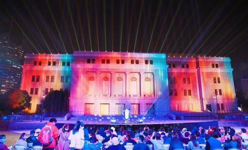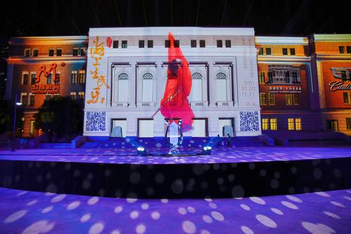 图片说明:2021年11月2日,上海音乐厅大型3D Mapping墙体灯光艺术投影秀。