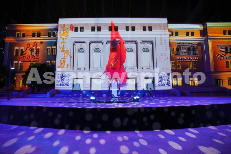 图片说明:2021年11月2日,上海音乐厅历史老建筑上演大型3D Mapping墙体灯光艺术投影秀《海上生民乐之光音的故事》。
