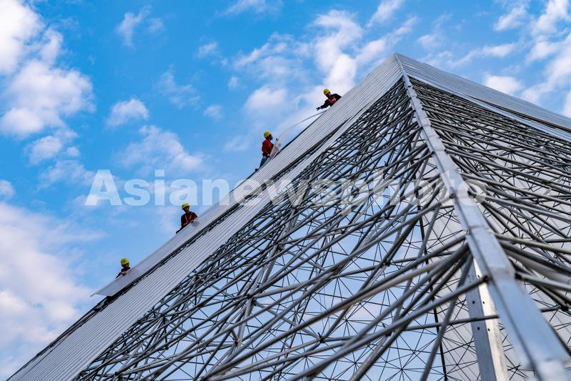 2021年11月4日,安徽省合肥市肥东县桥头集镇的安徽现代雾耕农业科技示范园项目一期建设工地,工人们正在铺设雾耕植物工厂温室阳光板。