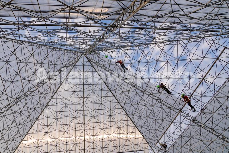 2021年11月4日,安徽省合肥市肥东县桥头集镇的安徽现代雾耕农业科技示范园项目一期建设工地,工人们正在铺设雾耕植物工厂温室阳光板。