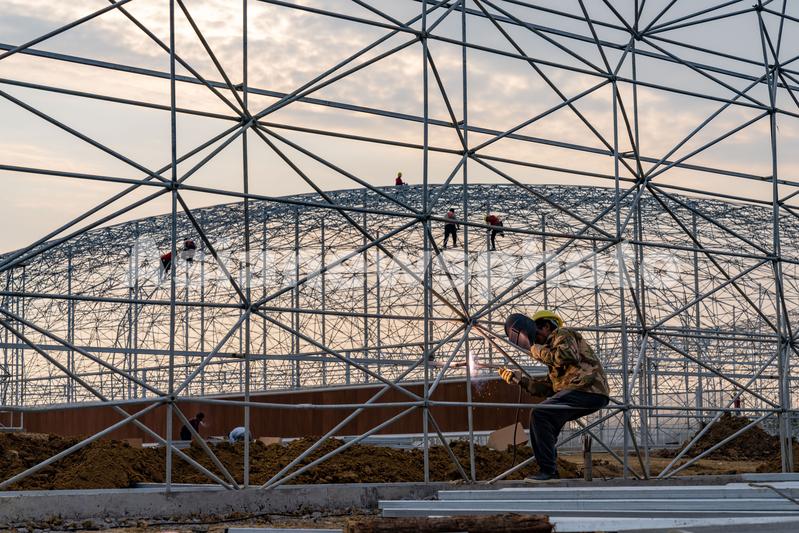 2021年11月4日,安徽省合肥市肥东县桥头集镇的安徽现代雾耕农业科技示范园项目一期建设工地,工人们正在焊接加固雾耕植物工厂温室钢架。