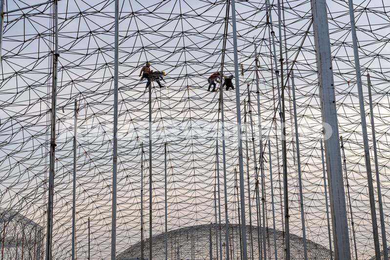 2021年11月4日,安徽省合肥市肥东县桥头集镇的安徽现代雾耕农业科技示范园项目一期建设工地,工人们正在焊接加固雾耕植物工厂温室钢架。