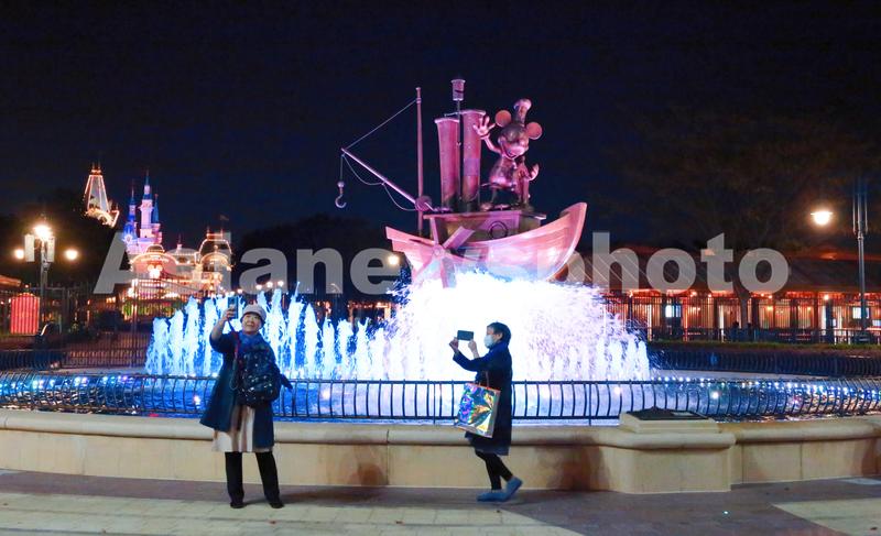 图片说明:2021年11月3日,上海,迪士尼乐园米老鼠喷泉广场夜景吸引游客打卡。
