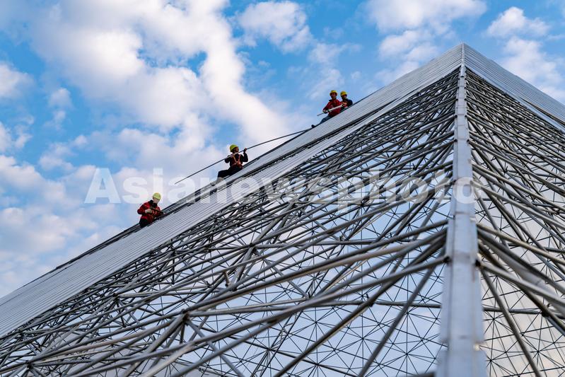 2021年11月4日,安徽省合肥市肥东县桥头集镇的安徽现代雾耕农业科技示范园项目一期建设工地,工人们正在铺设雾耕植物工厂温室阳光板。