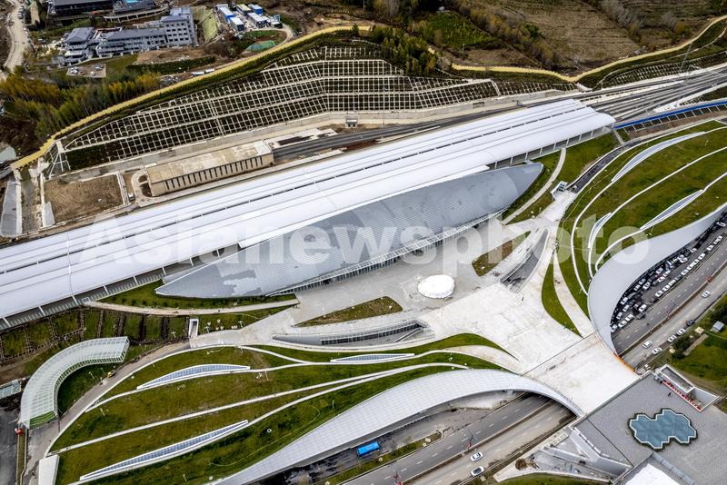 图片说明:2021年10月5日,河北省张家口市崇礼区四台嘴乡太子城村,太子城火车站。(无人机航拍)