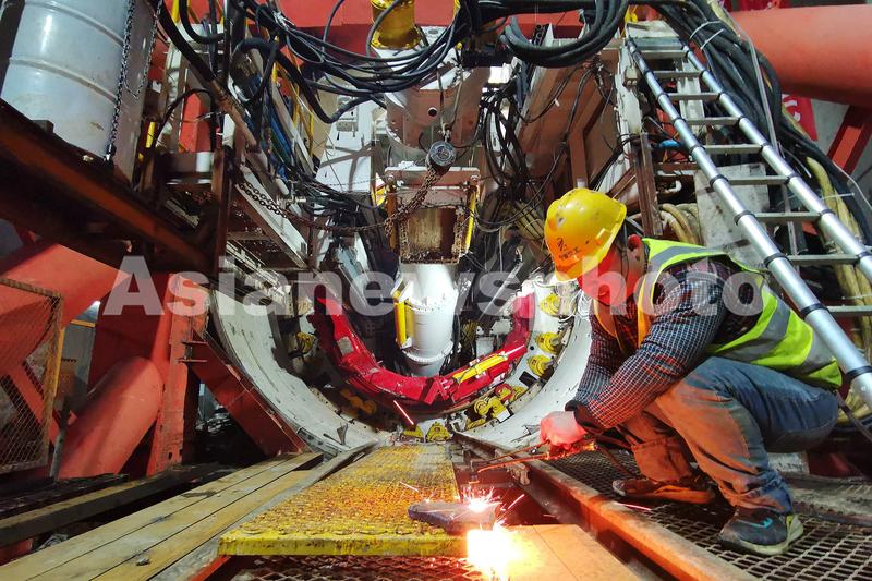 2021年11月8日,浙江省宁波市世纪大道地下综合管廊项目工地的建设工人们赶工安装调试“世纪号”盾构机。