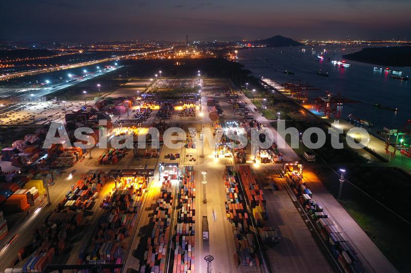 图片说明:2021年11月11日,航拍夜幕下的南京港龙潭集装箱码头。