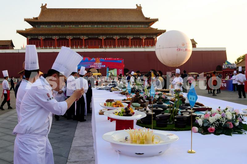 图片说明:2021年11月14日,,浙江省金华市东阳横店影视城明清宫苑,参赛选手们在参观拍照同行烹饪作品。