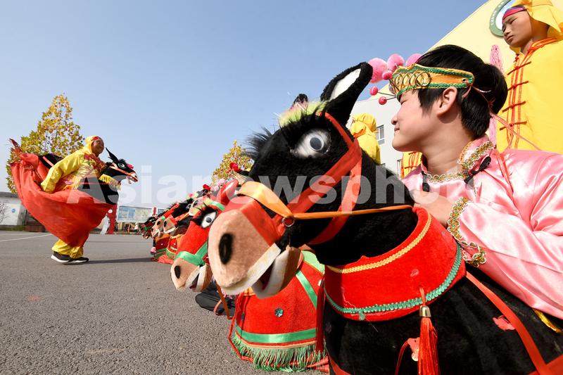 图片说明:11月17日,在河北省邯郸市肥乡区肥乡镇常耳寨小学,跑竹马民间艺人侯春梅在指导学生跑竹马技艺。