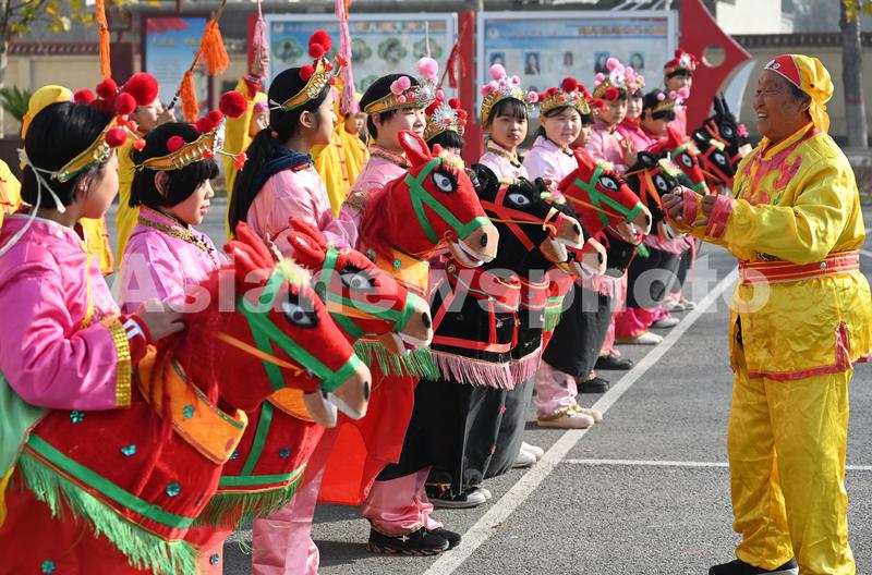 图片说明:11月17日,在河北省邯郸市肥乡区肥乡镇常耳寨小学,跑竹马民间艺人侯春梅在指导学生跑竹马技艺。