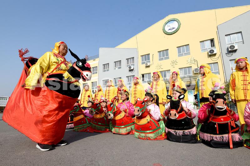 图片说明:11月17日,在河北省邯郸市肥乡区肥乡镇常耳寨小学,跑竹马民间艺人侯春梅在指导学生跑竹马技艺。
