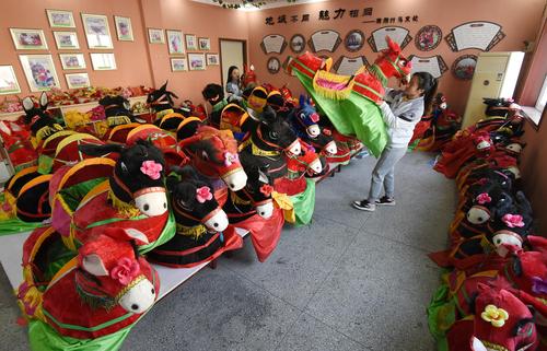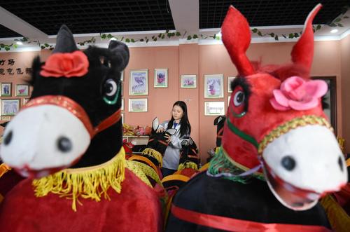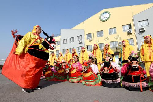 图片说明:11月17日,在河北省邯郸市肥乡区肥乡镇常耳寨小学,跑竹马民间艺人侯春梅在指导学生跑竹马技艺。