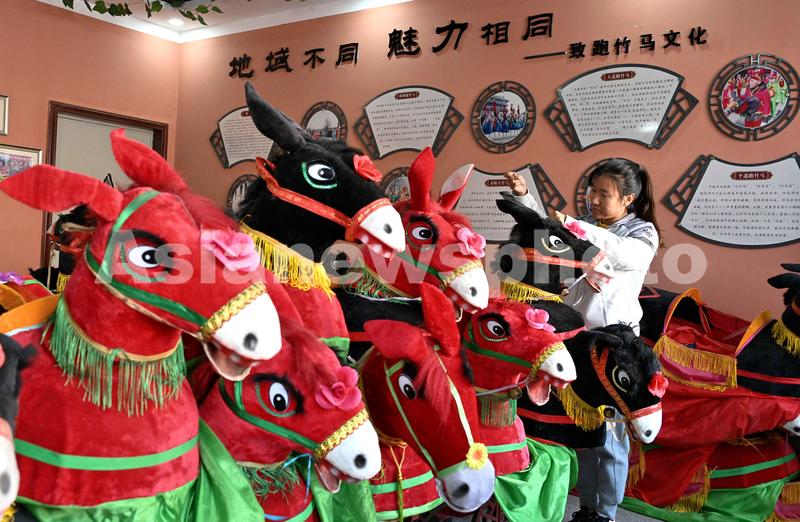 图片说明:11月17日,在河北省邯郸市肥乡区肥乡镇常耳寨小学跑竹马活动室,老师在修补竹马。