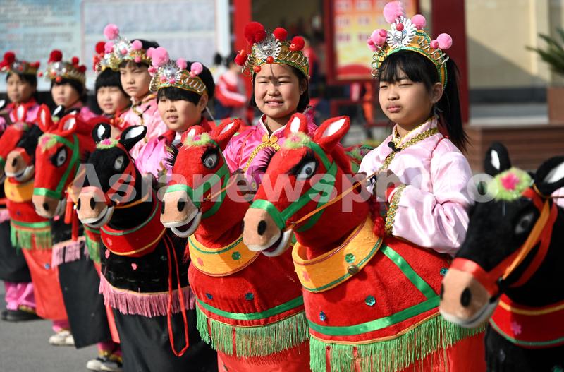 图片说明:11月17日,河北省邯郸市肥乡区肥乡镇常耳寨小学的学生在学习跑竹马技艺。