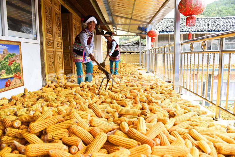 2021年11月16日,云南省大理州巍山县五印乡新民村委会别落古村彝族群众在家里晾晒玉米。初冬时节,云南省大理白族自治州巍山彝族回族自治县18万亩玉米喜获丰收,当地农民抢抓农时节令,抓紧收获晾晒金黄色的玉米,乡村一派丰收繁忙的喜人景象。近年来,巍山县党建引领粮食产业发展,积极调整农业种植结构,全面推进高标准农田建设,保障粮食生产安全,促进粮食增产农民增收。