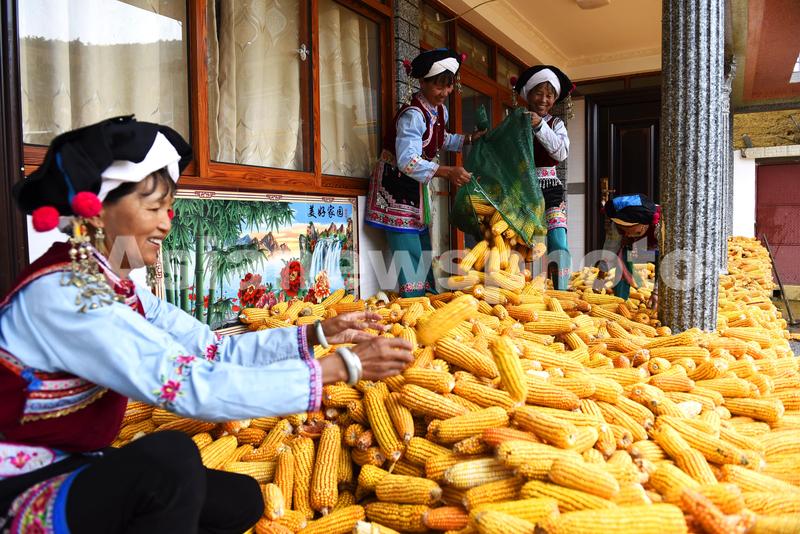 2021年11月16日,云南省大理州巍山县五印乡新民村委会别落古村彝族群众在家里晾晒玉米。初冬时节,云南省大理白族自治州巍山彝族回族自治县18万亩玉米喜获丰收,当地农民抢抓农时节令,抓紧收获晾晒金黄色的玉米,乡村一派丰收繁忙的喜人景象。近年来,巍山县党建引领粮食产业发展,积极调整农业种植结构,全面推进高标准农田建设,保障粮食生产安全,促进粮食增产农民增收。