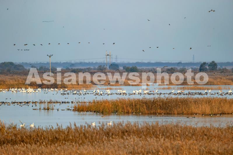 图片说明:11月16日,在黄河三角洲国家级自然保护区内,各种鸟类嬉戏觅食。